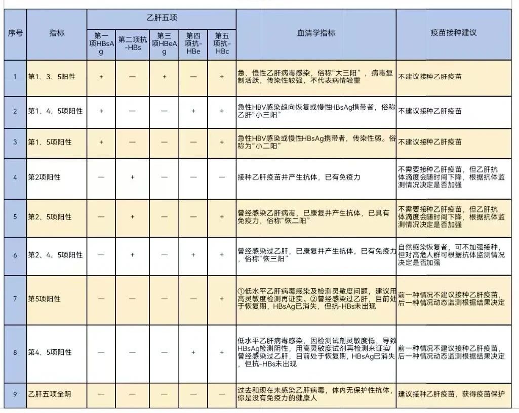 乙肝“两对半”一共有五项指标,而这五项指标又可以衍生出32个组合,由此又分9种常见模式、16种少见模式、7种罕见模式。