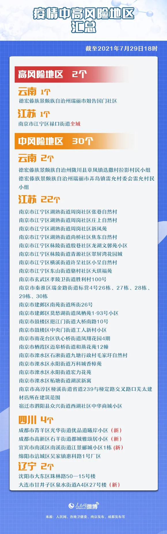 7月29日0—24时,31个省(自治区、直辖市)和新疆生产建设兵团报告新增确诊病例64例,其中境外输入病例43例(云南21例,广东9例,上海7例,福建3例,辽宁1例,山东1例,四川1例),本土病例21例(江苏18例,湖南2例,北京1例);无新增死亡病例;新增疑似病例1例,为境外输入病例(在上海)。(信息来自“国家卫生健康委员会官方网站”)