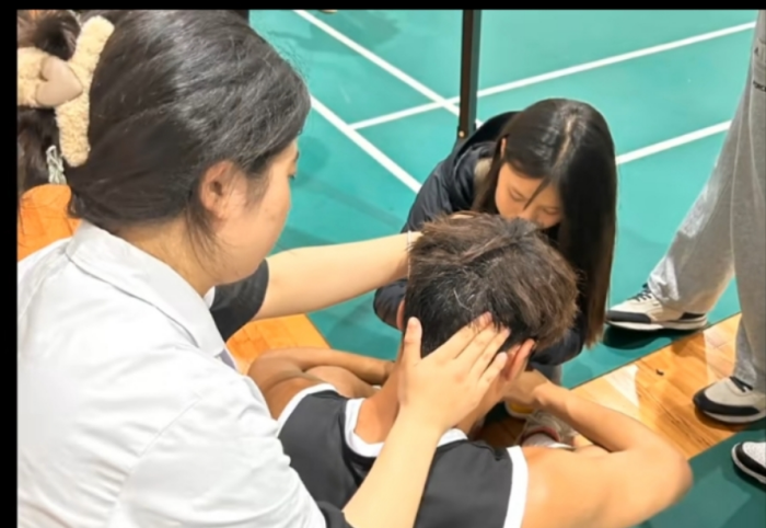 赛场上你争我夺、你攻我守、投球动作帅气利落。在整个比赛中,篮球健儿们血气方刚,奋力拼搏。在比赛中,一名参赛选手不幸摔倒,并出现眩晕症状,这一情况立即引起了南丁格尔志愿服务队的关注,并迅速启动了紧急救援机制。救援队对该选手进行了初步检查,最终确定该选手是低血糖导致体力不支的情况,救援队立刻让其口食用葡萄糖15-20g,为晕倒的选手调整到舒适的姿势,该选手在数十分钟后症状消失,救援队又对选手摔伤的腿部进行了包扎,保证了该选手的人身安全。