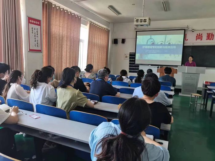 刘学梅主任以《护理领域专利创新与临床应用》为题,从专利相关政策、法规,专利的类型、如何从生活中挖掘专利创意、如何撰写专利和如何申请专利等多个方面进行了分享,并与参会青年教师进行了交流互动。
