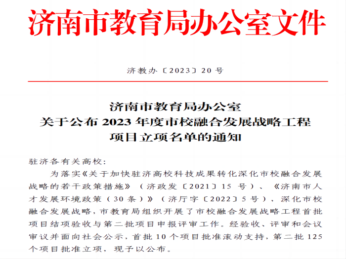 济南市市校融合发展战略工程项目是济南市委市政府支持驻济高校发展的重大战略部署,是加快高校科技成果转化落地,推动科创济南、智造济南、文化济南、生态济南、康养济南“五个济南”建设的重要举措。本次项目立项标志着学院专业集群建设工作取得了实质性进展。