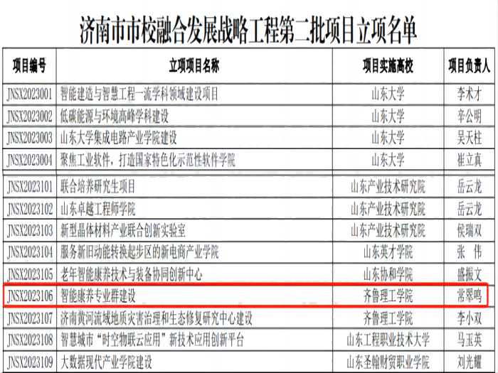 12月27日,济南市教育局办公室发布了《2023年度市校融合发展战略工程项目立项名单的通知》(济教办〔2023〕20 号),学院申报的“智能康养专业群建设”项目获立项,获批支持资金50万元。