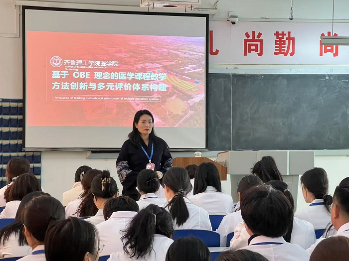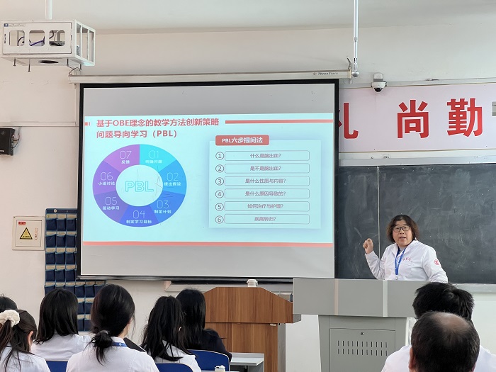 随后,教学副院长路明静结合学校OBE教育理念落实专项培训的内容,分析了传统医学教学的挑战与不足、结合教学实例分析了基于OBE理念的教学设计流程与要点、教学方法创新策略、多元化评价体系的构建原则与方法,并以《内科护理学》课程中的脑出血为例,讲解了PBL+任务驱动的教学方法,使教师们深入理解OBE理念,掌握OBE教学设计和考核评价的方法。
