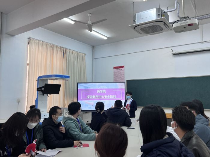 孔群主任重点讲解了实验室安全卫生守则、实验室规则、学生实验守则、实验室安全操作规程等,提醒大家加强安全防范意识,规范使用仪器设备,结合案例对常见问题及处理方法进行了详细讲解,包括实验室气瓶安全放置、药品的管理、化学试剂的摆放及处理、锐器的储存、玻璃容器的安全使用。