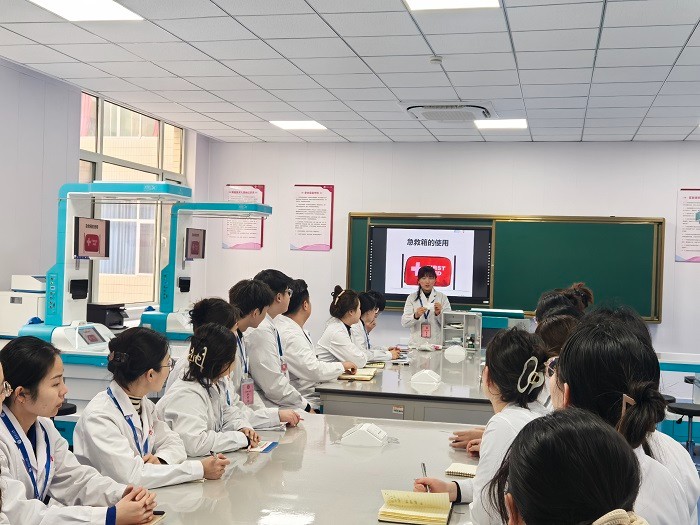 随后,刘婵娟老师重点讲解了急救箱的使用方法,包括常见实验伤害的应急处理措施,如割伤、烫伤、化学品灼伤等,并现场演示了止血、包扎、心肺复苏等急救技能。参训师生认真聆听,积极参与互动,并在老师的指导下进行了实操演练,掌握了基本的急救技能。