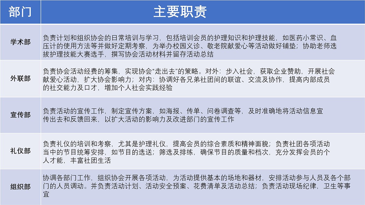 齐鲁护理协会设有会长与指导老师各一名,下辖组织部、外联部、宣传部、学术部、实践部五个职能部门。现有社员一百余人,主要来自护理学、护理和助产专业。协会自创办以来,开展“护理知识宣讲”“社区健康义诊”“敬老院关怀服务”“护理礼仪风采展示”“护理技能实训”等品牌活动,丰富学生课余生活,锻炼学生实践能力。在指导教师与全体社员的努力下,齐鲁护理协会多次荣获问鼎网页版登录入口“优秀社团”的荣誉称号。
