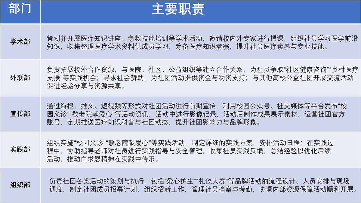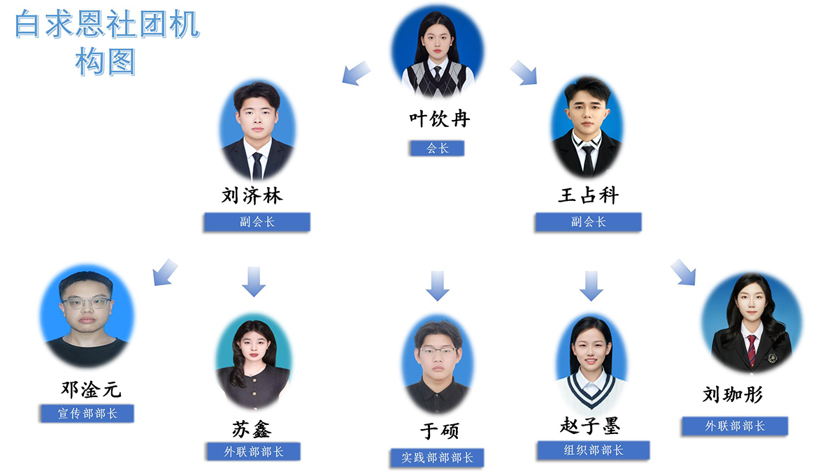 齐鲁理工学院白求恩社设有会长和指导老师各一名,下设组织部、宣传部、学术部、外联部、实践部三个职能部门,现有社员一百余人,分别来自护理学、护理和助产专业。协会自创办以来,开展“爱心护生”“校园义诊”“敬老院献爱心”“礼仪大赛”“技能培训”等品牌活动,丰富学生课余生活,锻炼学生实践能力。白求恩社定期组织成员参与校园义诊、社区健康咨询、乡村医疗支援等活动,将白求恩精神融入实践,服务社会。社团还开展医疗知识讲座,提高学生的医疗素养和急救能力。加入白求恩社,让我们一起用行动诠释医者仁心。