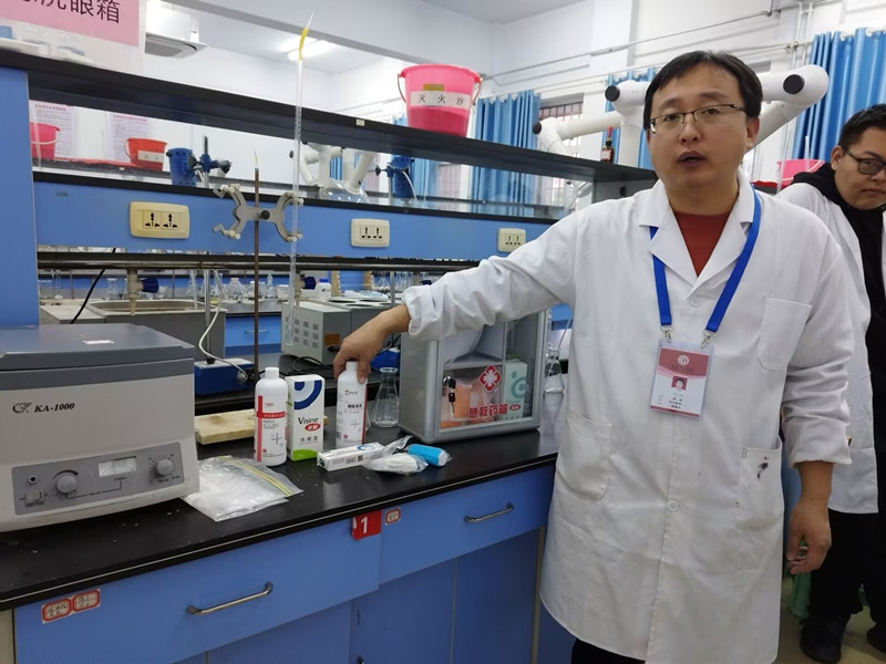 实验员郭超老师介绍急救箱里的物品药品及其使用方法,并演示在遇到酸腐蚀或碱腐蚀时正确的处理方法。