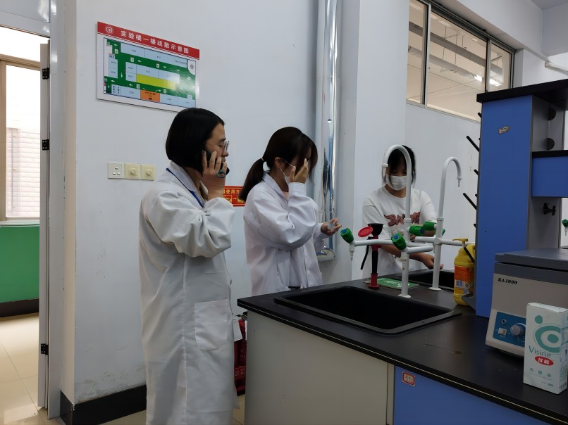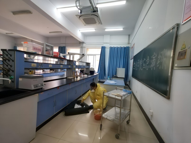 8.待抢险组组长杨兴琳汇报泄漏试剂已经处理完毕,实验室空气环境良好,现场卫生已打扫干净,实验室恢复正常。