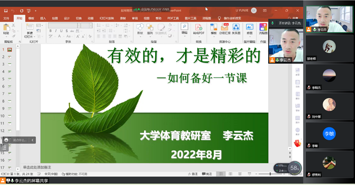 此次培训由大学体育教研室、大学英语教研室、大学物理教研室7名骨干教师做讲座,分享教育教学知识。基础党支部李云杰书记向全体教师呈现了第一场精彩的报告——如何有效备课。李书记从备课与备好课的关系、如何备好一节课、怎样编写教学设计(教案)三个方面阐释了如何有效备课。备课是整个课堂教学工作的起点,是上好课的重要前提与保证。没有备课时的全面考虑与周密设计,就没有课堂上的有效引导与动态生成;没有上课前的胸有成竹,就没有课堂中的游刃有余。而备好课更需要老师们潜心研究、博采众长、实践反思、梳理内化。