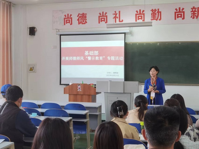 更新时间:2022-10-21 13:33 10月21日上午,基础部全体教师在教学楼A313开展师德师风警示教育专题活动。会议由基础部主任蔡秀国教授主持,教师发展中心主任于晓丽教授及基础部全体教职工参加了本次活动。
