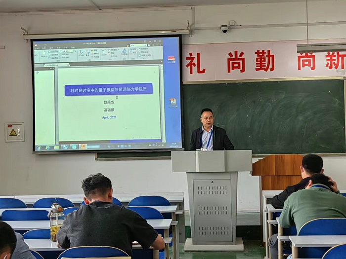 活动伊始,蔡教授强调了本次学术交流活动的重要性。随后全体教师听取了赵英杰博士的讲座“非对易时空中的量子模型与黑洞热力学性质。”讲座中,赵博士就他的学术研究方向进行了分享,讲述了量子力学在黑洞中的应用。通过本次交流学习,深刻理解了科研的学术性与专业性,为教师指明了科研方向。