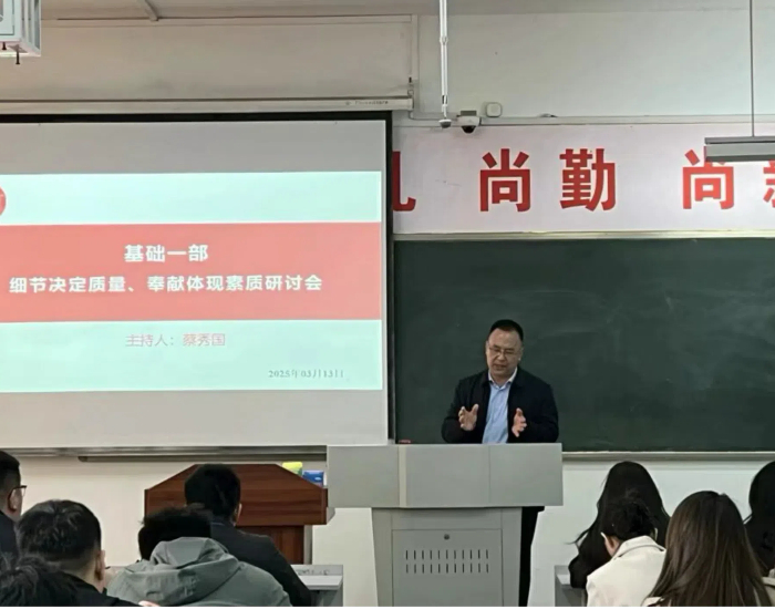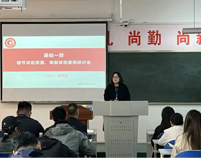 更新时间:2025-03-13 18:42 3月13日上午8点半,基础一部在教学楼A206召开了一场以“细节决定质量、奉献体现素质”为主题的研讨会,旨在贯彻6S校园与教师养德修为工程工作,推动学校高质量发展,提升教师个人修养。此次研讨会由基础一部蔡秀国主任主持,部门全体教师参与。
