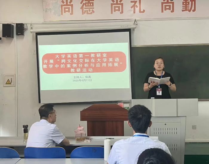 更新时间:2025-06-11 20:44 6月11日,大学英语第一教研室成功召开“跨文化交际在大学英语教学中的案例分析与应用拓展”研讨会。本次研讨会由包燕老师主持,大学英语第一教研室全体教师参加。会议旨在构建‘语言 — 文化 — 思维’三位一体的大学英语教学新范式,培养具有全球视野、文化自觉和跨文化沟通能力的新时代人才。