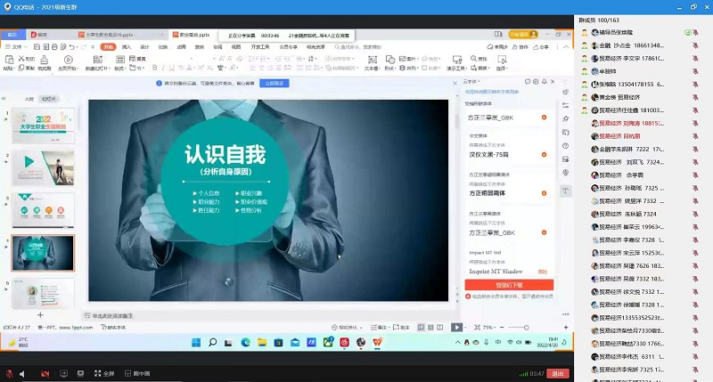 更新时间:2022-05-02 10:21 当前,大学生就业形势日益严峻。为做好受新冠肺炎疫情影响下的大学生就业工作,帮助学生明确就业方向,提高就业质量,我院于4月21日晚召开线上就业指导服务系列讲座——“大学生职业生涯规划”。本次讲座的主讲人为2021级辅导员老师张焕隆,2021级贸易经济、2021级金融学、2021级投资学三个专业共160名学生参与此次讲座。