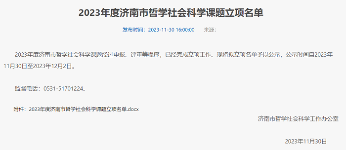 更新时间:2023-12-04 10:33 近日,济南市哲学社会科学工作办公室公示了2023年度济南市哲学社会科学课题立项名单,我院有2项课题获得立项,其中重点项目1项,一般项目1项。据统计,2023年度济南市哲学社会科学课题共立项184项,其中,重点项目53项,一般项目131项。