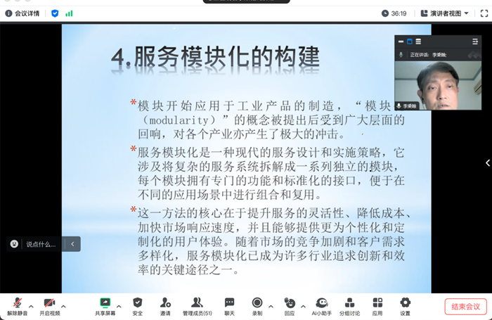 更新时间:2024-05-20 15:46 5月17日19:30-21:00,商学院在腾讯会议开展本月学术活动,本次学术活动由商学院博士李秉翰教授带来主题为《服务模块化的构建与应用》的学术讲座。