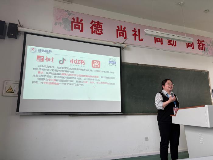 更新时间:2025-04-24 14:24 2025年4月23日,商学院贸易经济教研室围绕“任务驱动视角下高校教师教学方法改革”主题,举办了一场理论与实践深度融合的教学研讨活动。王芳老师以“民族品牌文化符号的提炼与传播”为案例,呈现了一堂生动精彩的任务驱动式教学示范课,为课堂教学改革提供了创新范本。