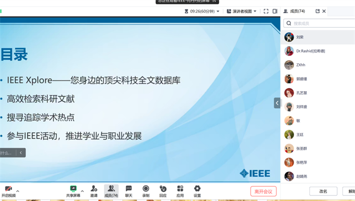 学院邀请了湘潭大学贺少波副教授针对高水平论文的撰写和发表的方法和技巧进行了线上报告和指导,Muhammad Rashid Naeem博士、Mansoor Khan博士针对计算机领域的相关创新和成果进行了报告和分享,雷腾飞副院长针对电子信息学科的科研政策进行了解读和宣传、IEEE中国资讯部何丹丹经理对数据库的使用方法和IEEE的相关活动做了介绍。