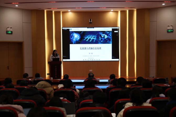 郭教授深度解析了“纳米薄膜忆阻器与忆阻模型”、“忆阻非线性电路和读写电路”、“忆阻神经突触与类脑信息处理”以及“新型忆阻器与感存算法”四大方面,系统性地阐述了忆阻薄膜的制备、建模与应用的基本理论,着重介绍了忆阻神经突触与类脑信息处理,尖峰信号实现的巴普洛夫联想实验过程,以及忆阻LSTM网络智能处理系统在文本情感分析上的应用。这些理论不仅在性能上超越了传统计算机软件模拟,更为类脑信息处理领域带来了新的思路。报告结束后,郭教授与我院教师就类脑文本情感LSTM网络智能处理、忆阻卷积神经网络、忆阻器纳米薄膜性能改进等问题展开深入讨论,交流气氛热烈。