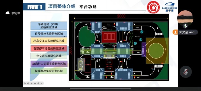 在验收会中,项目经理郭文强对项目进行整体介绍。并演示了绿波车速引导、弱势交通参与者识别预警、公交车站临时停靠、多车跟驰编队、智慧停车厂、路侧信息发布系统、高/快速路段、高价区间测速、电子警察系统、多维孪生映射系统等功能,之后刘生强对项目的实景模型进行了展示。
