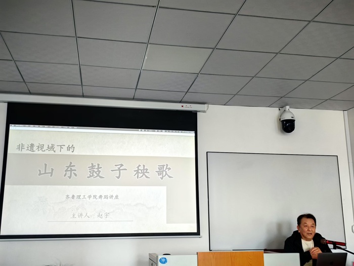赵宇教授结合自身几十年的创作、表演和研究经验,系统阐述了山东鼓子秧歌概述、溯源、分布与风格流派、角色构成、表演流程、独特场阵几个方面,通过讲、演结合的方式全面地讲解了山东鼓子秧歌,让学生对鼓子秧歌的派别和风格特征有了多样的认识和掌握,从而达到全面、综合、多维度的学习目的。赵教授更是通过多次亲自示范、交流互动等形式,展示生动形象的舞蹈动作,开拓了学术思维,丰富了艺术视野,让在场师生深切感受到鼓子秧歌所散发出的艺术魅力,师生受益匪浅。