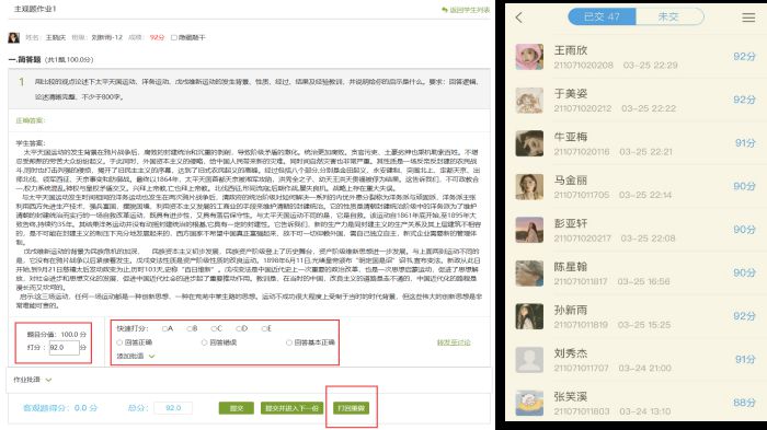 教师根据学生的答题内容是否规范、语言组织是否逻辑、表达是否准确等进行批阅给分,且可以附加作业点评。对于回答错误的情况可以通过打回重做功能让学生进行反思与再次答题,然后得到相应的分数。同时针对于不同类型的作业,除了具体分数外,也可以按照等级或答题大方向进行批阅,让学生对自己的学习有更加明确有效的把握。