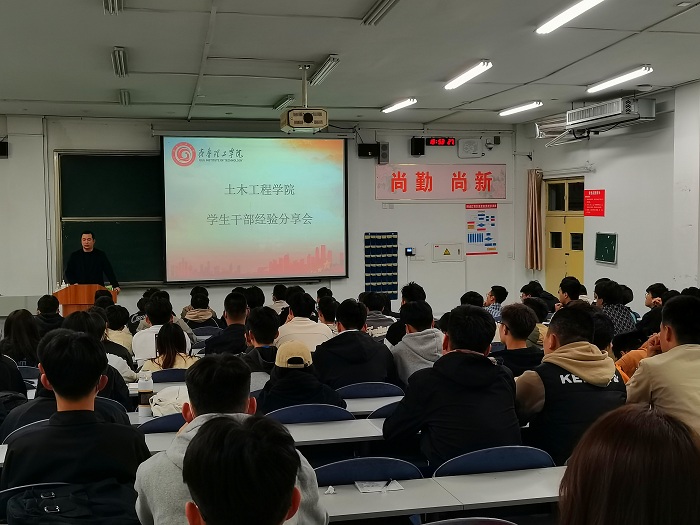 3月27日晚,土木工程学院于教学楼A410举办学生干部经验分享会。土木工程学院学生管理副院长韩震、学生科长戴成明、全体辅导员及各班班长、团支书参加。