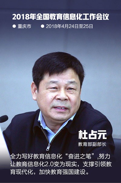中国教育信息化网讯 4月24-25日,2018年全国教育信息化工作会议在重庆璧山召开。教育部副部长杜占元出席会议并讲话。重庆市副市长屈谦出席会议并致辞。