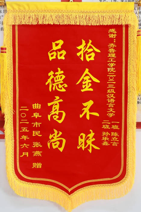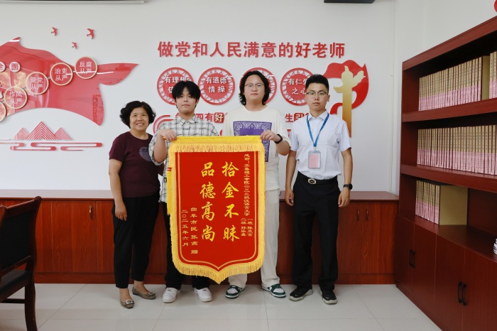 当天下午3时,失主市民张女士经派出所协助联系校方,专程向学院送来印有“拾金不昧 品德高尚”的锦旗,对两位同学拾金不昧的行为给予高度赞扬,称其用实际行动展现了当代大学生良好的精神风貌和道德素养,为广大青年树立优秀榜样。