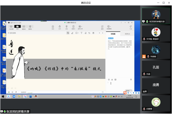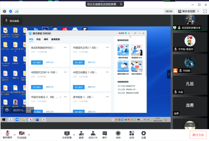 会上,汉语言文学教研室张滨郑老师以实际操作的方式,与各位老师线上交流了腾讯课堂与超星网络平台配合使用的方法和经验。从下载安装、注册登录、课前准备、授课模式、互动工具、教学评价等多方面进行了实际操作,并针对老师们在使用腾讯课堂过程中遇到的问题进行了一一解答和交流。