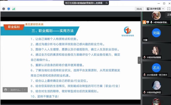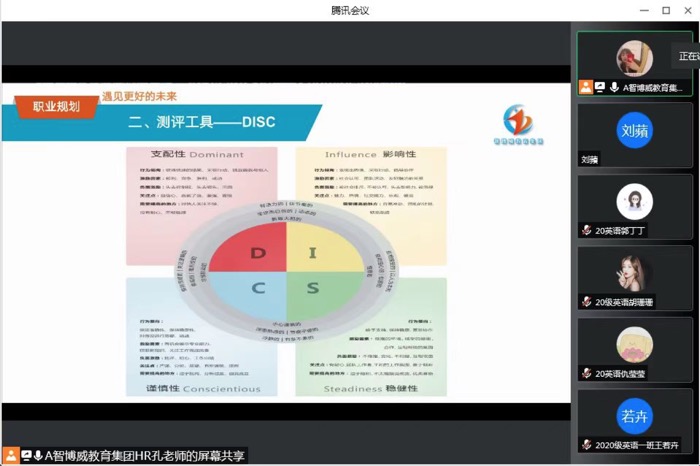 更新时间:2022-05-15 13:45 5月14日,文学院邀请山东智博威教育科技集团金牌讲师付碧波讲师为我院英语专业学生做题为《如何准确认识你自己》线上职业规划专题讲座。