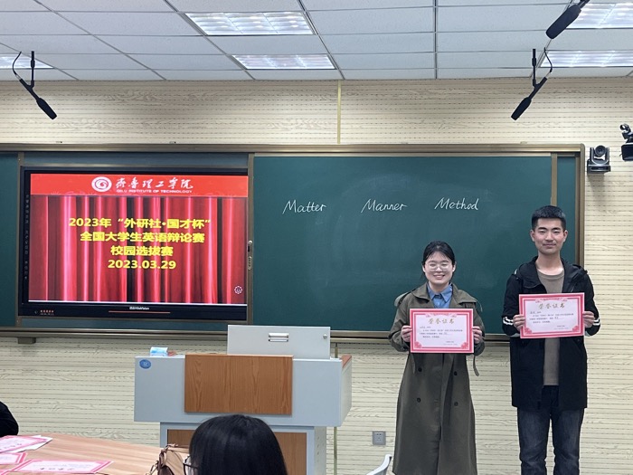 本次比赛采用英国议会制辩论赛制,该赛制是广受赞誉的非盈利性英语辩论赛,辩论赛辩题为This House believes that schools should train students in vocational skills to the exclusion of the liberal arts,旨在引导学生思考人文学科对人的全面成长的重要意义,启发学生进一步思考如何在信息化时代提高职业技能,拥抱时代浪潮,做一名终身学习者。赛场上,辩手们纵横捭阖、广开言路。经过两个多小时的激烈比赛,文学院张硕、仇莹莹2位同学以优异成绩获本次校园选拔赛一等奖,他们将代表学校参加外研社全国大学生英语辩论赛华东赛区比赛。