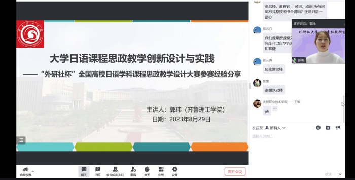 分享会上,郭玮老师结合自己参赛经验,围绕大学日语课程如何优化教学设计、如何融入思政元素、参加思政教学设计大赛如何备赛等发表了自己的看法,并结合课堂教学设计实例进行了展示,充分发挥示范引领作用,受到了与会教师的好评。