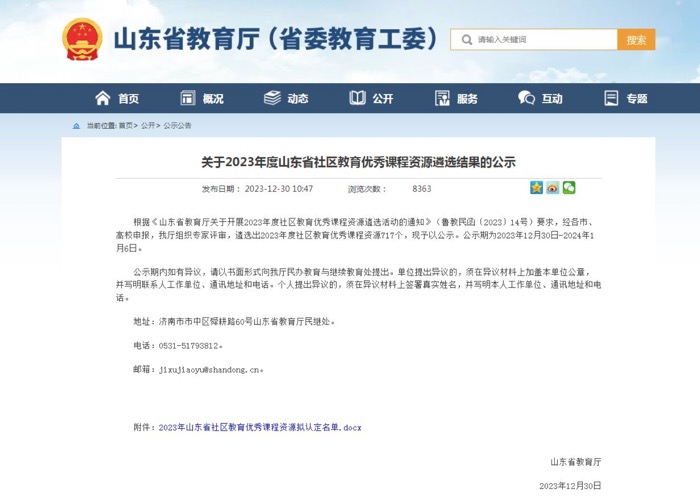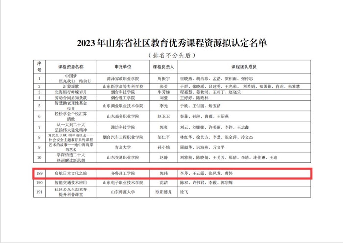 更新时间:2024-01-01 09:09 12月30日,山东省教育厅公布了2023年度山东省社区教育优秀课程资源遴选结果,文学院日语专业郭玮老师负责的《启航日本文化之旅》课程成功入选。本次遴选根据《山东省教育厅关于开展2023年度社区教育优秀课程资源遴选活动的通知》(鲁教民函〔2023〕14号)要求,经各市、高校申报,由山东省教育厅组织专家评审,共遴选出2023年度社区教育优秀课程资源717个。