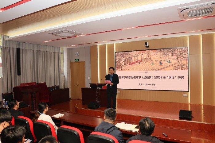 报告中,高金岭教授结合自己多年的研究经验,从翻译多模态化的视角出发,以鹿顶耳房钻山、抄手游廊和倒座抱厦厅为例,对《红楼梦》中的建筑术语进行了细致入微的分析。他指出,由于语言和文化差异,一些“误译”现象不仅影响了读者对原著的准确理解,也限制了中华文化的国际传播,通过多模态化融合的形式可以有效弥补传统文字翻译单一模态在跨文化交际中的局限性。最后,高教授耐心回答了师生们提出的问题,并就翻译研究的方法、路径以及未来发展趋势等话题同现场师生进行了深入的探讨。