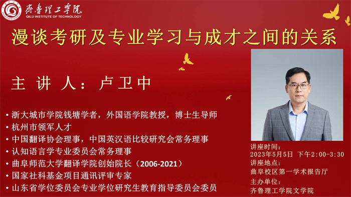 卢卫中,男,教授,浙大城市学院钱塘学者,外国语学院教授,博士生导师,杭州市领军人才,中国翻译协会理事,中国英汉语比较研究会常务理事,认知语言学专业委员会常务理事,曲阜师范大学翻译学院创始院长(2006-2021),国家社科基金项目通讯评审专家,山东省学位委员会专业学位研究生教育指导委员会委员。