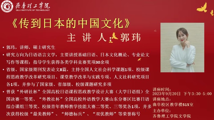 郭玮,讲师,硕士研究生。研究方向为日语语言文学,主要讲授基础日语、日本文化概论、专业论文写作等课程。省级、国家级期刊发表论文8篇,主持全国人文社会科学课题1项、校级课程思政教学改革研究项目、课堂教学改革与实践专项、人文社科研究项目各1项。并参与了国家级、省部级、校级课题研究多项。曾获“外研社杯”全国高校日语课程思政教学设计大赛(大学日语组)全国决赛一等奖、“外教社杯”全国高校外语教学大赛山东分赛区比赛日语综合课组三等奖、校级青年教师教学技能大赛二等奖、三等奖各1项,并多次获得校级“最美教师”、“师德标兵”、“双优教师”等荣誉称号。指导学生获得各类学科竞赛奖项30余项。