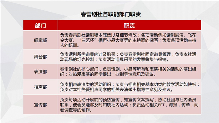 自创办以来,本社开展了诸多活动。2018年5月的《龙须沟》,12月的《屈原》以及2019年12月的《窝头会馆》无一不展现了春雷剧社的生命力。曲艺杯相声小品大赛一届又一届的开展以及各位同学的优秀表现体现了春雷剧社的无限潜力。这里是一个表演兴趣爱好者的汇聚地,这里是戏比天大的春雷剧社。