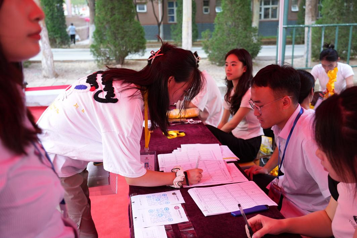 校门口至二级学院报到处随处可见教师和志愿者忙碌的身影,也处处洋溢着新生们的欢声笑语。志愿者为新生和家长提供细致周到的帮助,老师为新生解答疑惑,让报道秩序更加井然有序。在五号楼的学院报到处,新生顺利办理入学手续并领取必需品;其中还特别设置了签名墙与合影区,让新生们满怀憧憬地留下不少青春印记。
