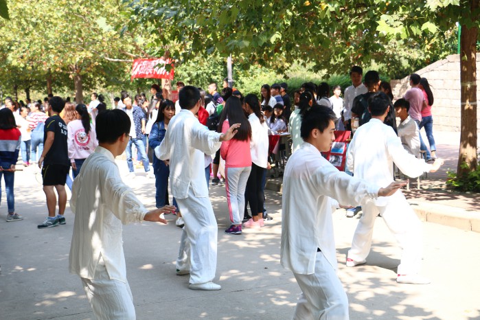 在校团委老师的带领下,各机构、社团干部们早早在大道两旁摆好了桌椅展板。中午十二点,伴随着下课铃声,各直属学生机构和社团精彩登场、各显风采,引得师生纷纷驻足参与。许多大一新生争先上前咨询直属学生机构和社团的具体情况,学生干部和社员们给大家耐心讲解;爵士舞、吉他等社团也纷纷为大家带来了精彩表演,掀起现场一个又一个高潮,许多同学纷纷报名加入了感兴趣的社团。已经参与过三届纳新工作的团委宣传部部长张义铭说:“我们希望通过社团纳新这样一种方式,给新生传递这样一种思想,你需要选择一种方式让自己的大学生活充实而富有意义。”