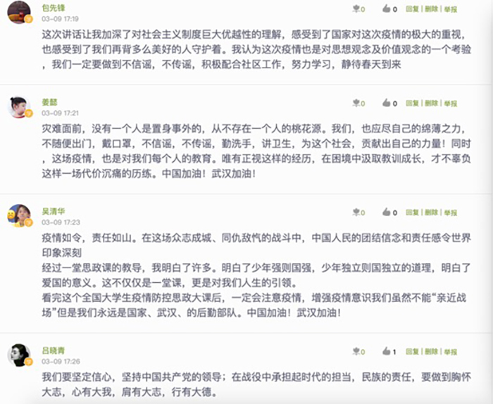 “思政大课”刚刚结束,在学校线上交流学习平台上,同学们抑制不住内心的激动,纷纷在键盘上敲出自己的“观后感”。不断刷屏的发言,出现频率最高的是大家平时很少说出的字眼:“英雄、逆行者、白衣战士、感动、感激、感恩、责任、震撼、坚定、家国、加油……”。突如其来的新冠肺炎疫情,让同学们对中国共产党的领导、对国家体制的强大、对中国特色社会主义制度的优势、对国家和人民的感情,就像化学反应一样,一下子产生了强大的共鸣、自豪、支持、信心。