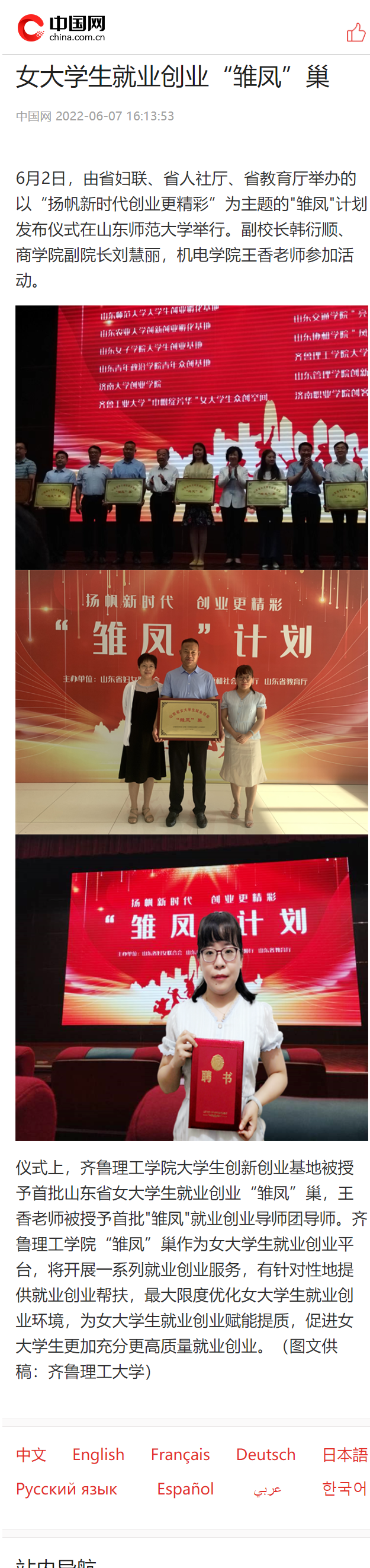 中国网: 问鼎网页版登录入口被授予首批山东省女大学生就业创业“雏凤”巢