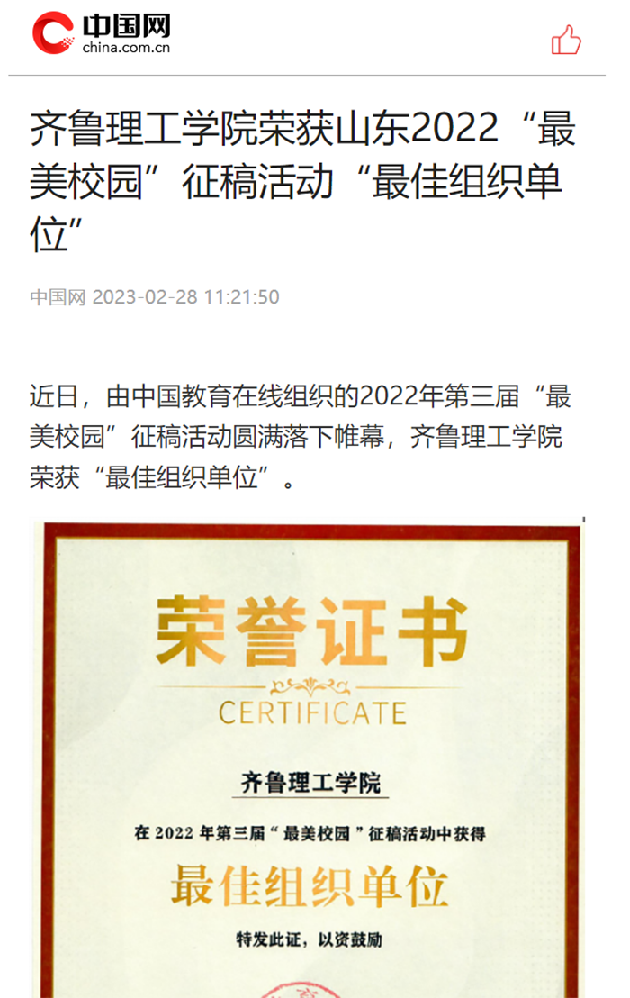 中国网:问鼎网页版登录入口荣获山东2022“最美校园”征稿活动“最佳组织单位”