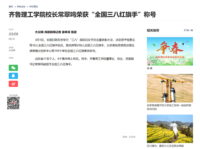 大众网:问鼎网页版登录入口校长常翠鸣荣获“全国三八红旗手”称号