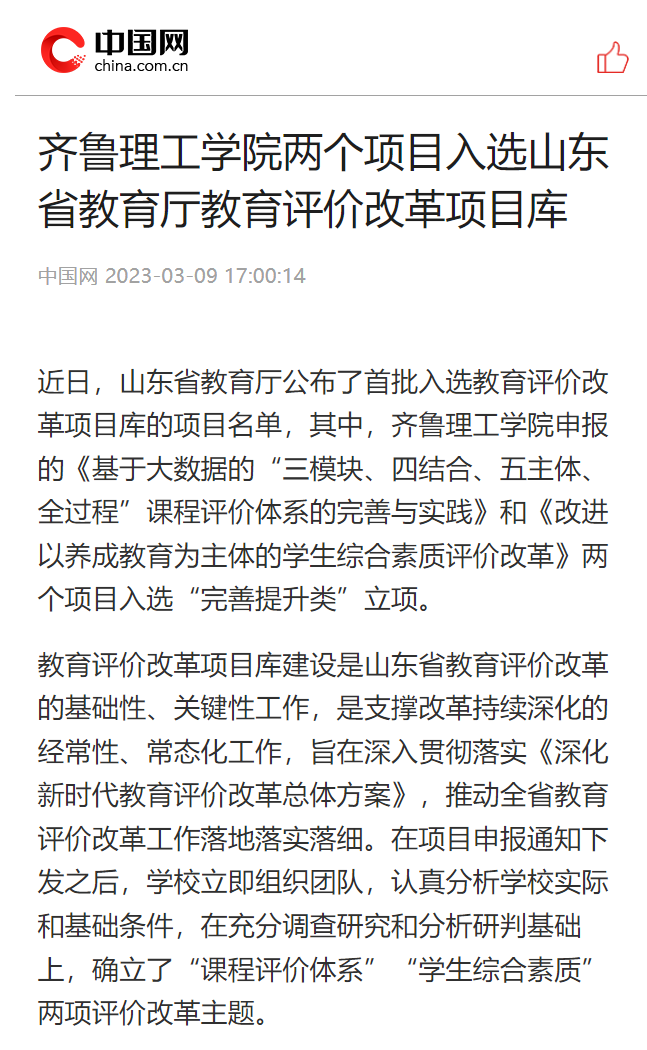 中国网:问鼎网页版登录入口两个项目入选山东省教育厅教育评价改革项目库