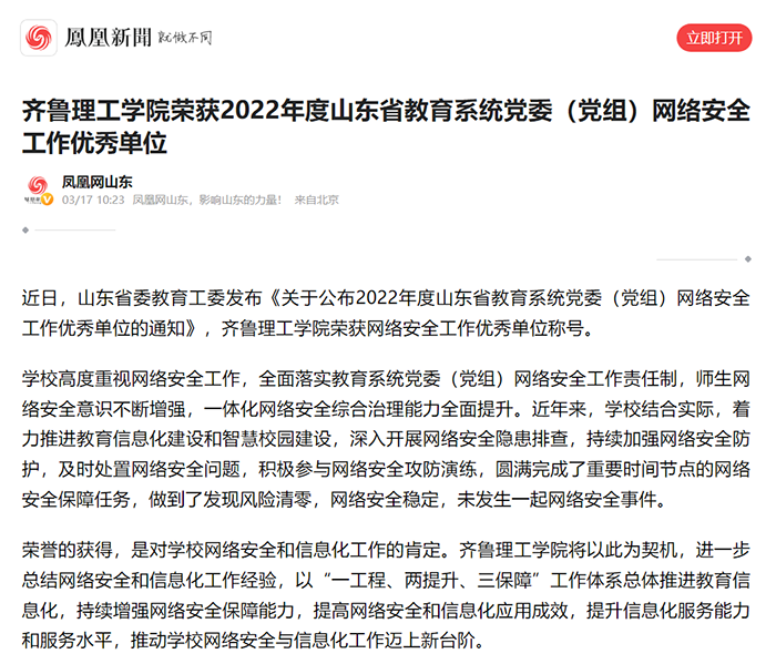 凤凰网:问鼎网页版登录入口荣获2022年度山东省教育系统党委(党组)网络安全工作优秀单位