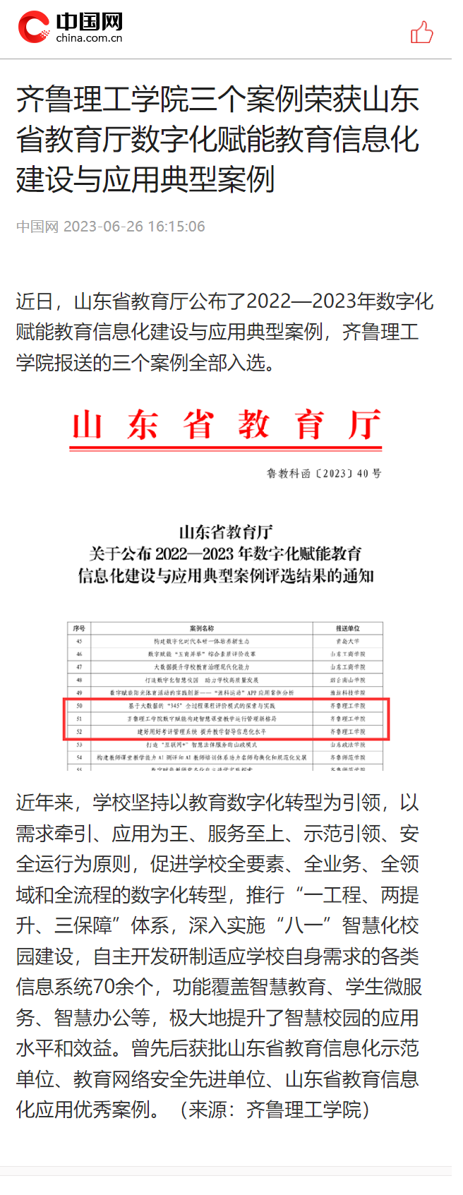 中国网:问鼎网页版登录入口三个案例荣获山东省教育厅数字化赋能教育信息化建设与应用典型案例