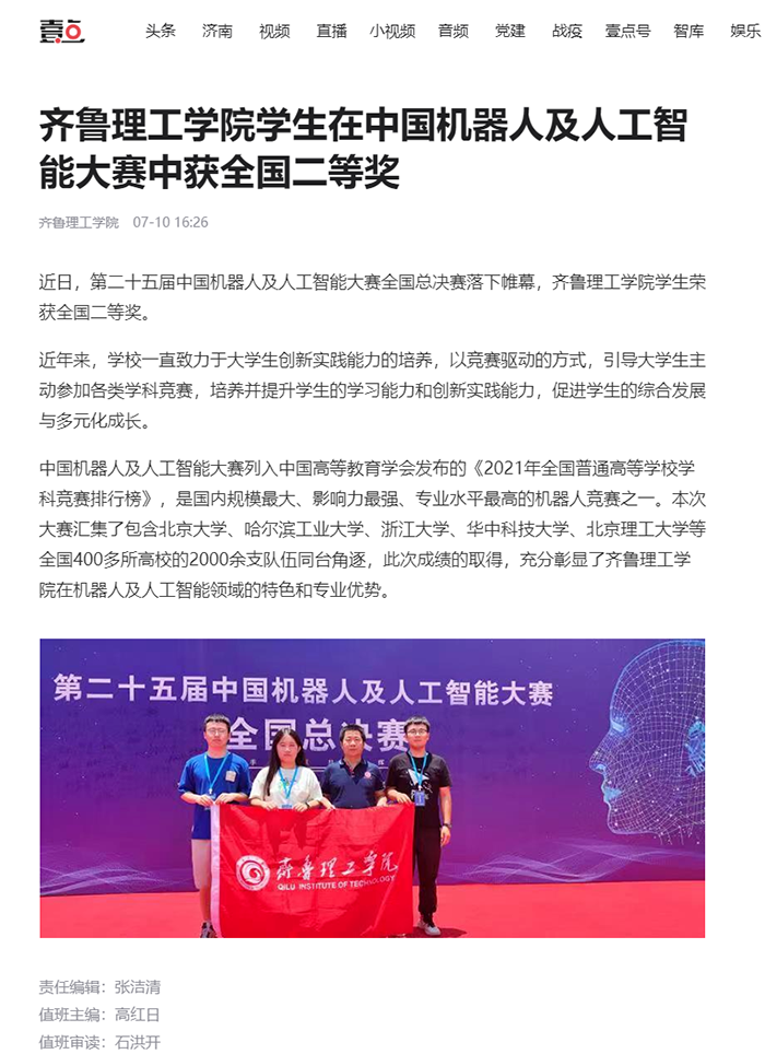 齐鲁壹点:问鼎网页版登录入口学生在中国机器人及人工智能大赛中获全国二等奖