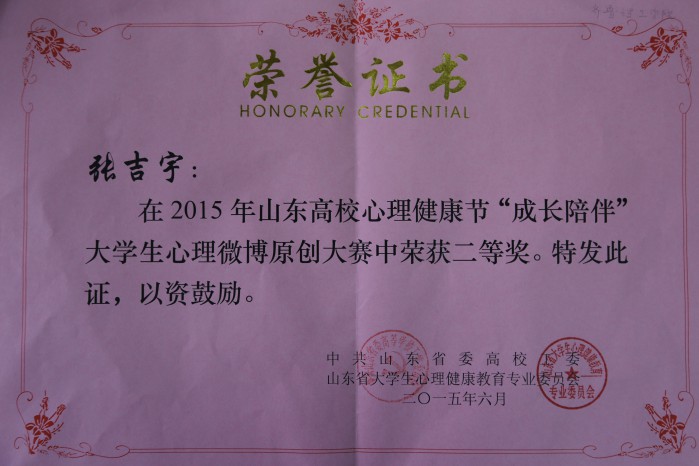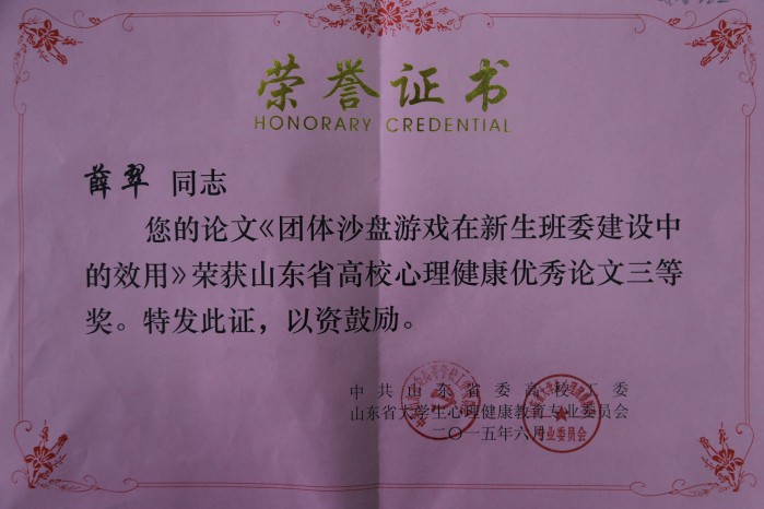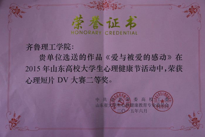 6月15日,山东省大学生心理健康教育专业委员会2015年学术年会在山东大学召开,对本次心理健康节获奖项目和获奖作品进行了表彰。我院心理DV作品《爱与被爱的感动》荣获心理短剧DV大赛二等奖;2013级产品设计张吉宇同学的微博荣获大学生心理微博原创大赛二等奖;薛翠老师的《团体沙盘游戏在新生班委建设中的效用》荣获优秀论文三等奖。